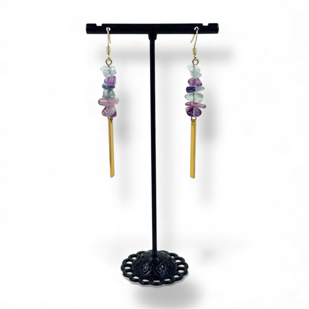 These gold-plated earrings feature Rainbow Fluorite gemstone chips stacked over gold plated brass rectangles.Â