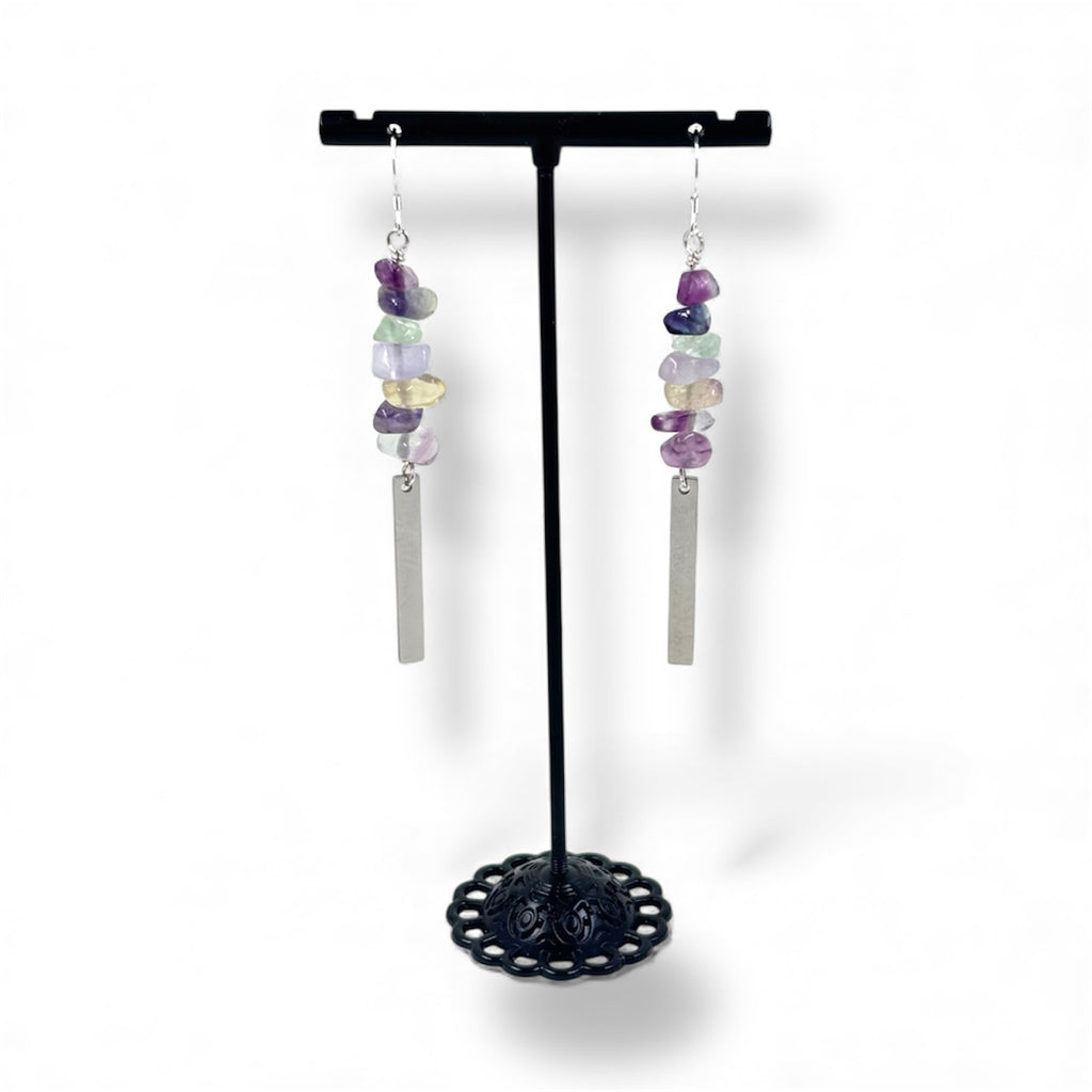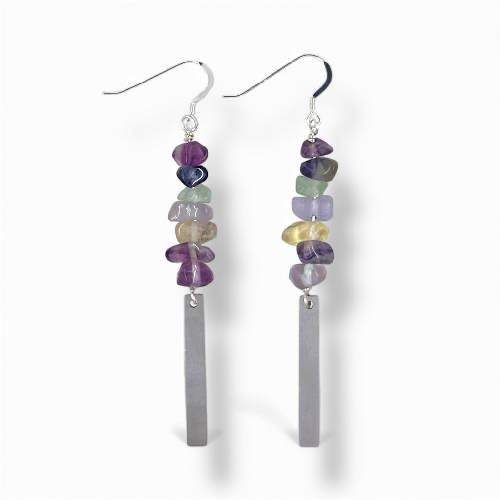 These handcrafted earrings feature Rainbow Fluorite gemstone chips stacked over tarnish resistant stainless-steel rectangles and sterling silver earring hooks.Â