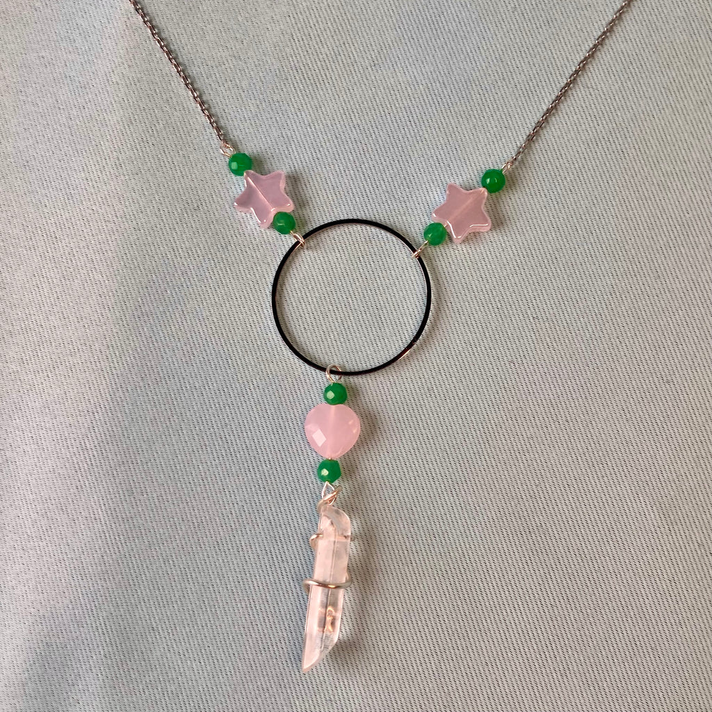 Unleash your inner Sailor Jupiter with this pretty AND powerful gemstone necklace! Featuring jade, quartz, and crystal beads, this natural silver stainless steel necklace is adorned with stars and hearts. Elegant and dainty, this combination of gemstones and crystals embody courage and truth, making these earrings a must-have for all Sailor Moon fans.